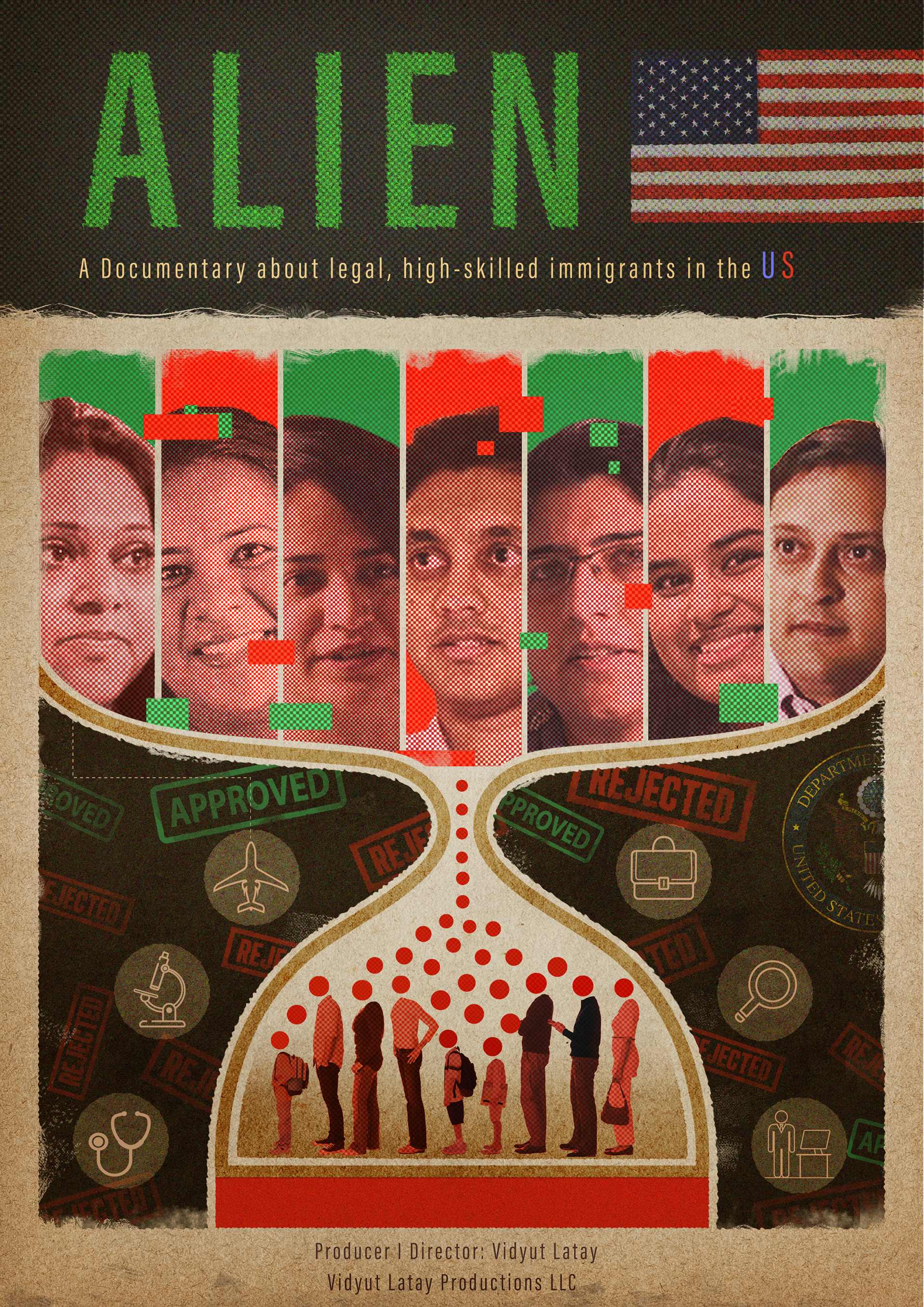 Poster design for Alien, highlighting the human cost of America’s dependence on high-skilled legal immigrants. The artwork focuses on the lived experiences of Indian immigrant families impacted by an inhumane and unfair system.