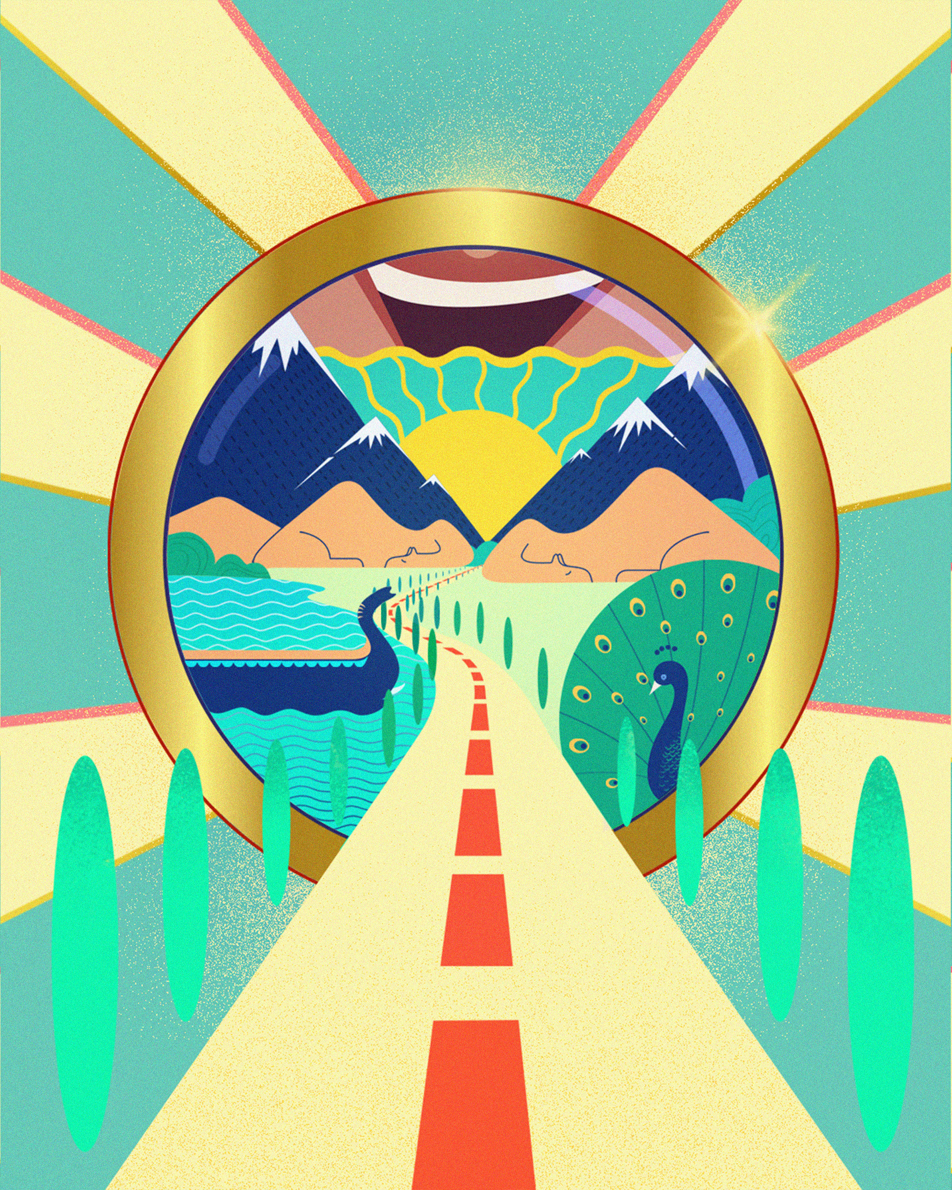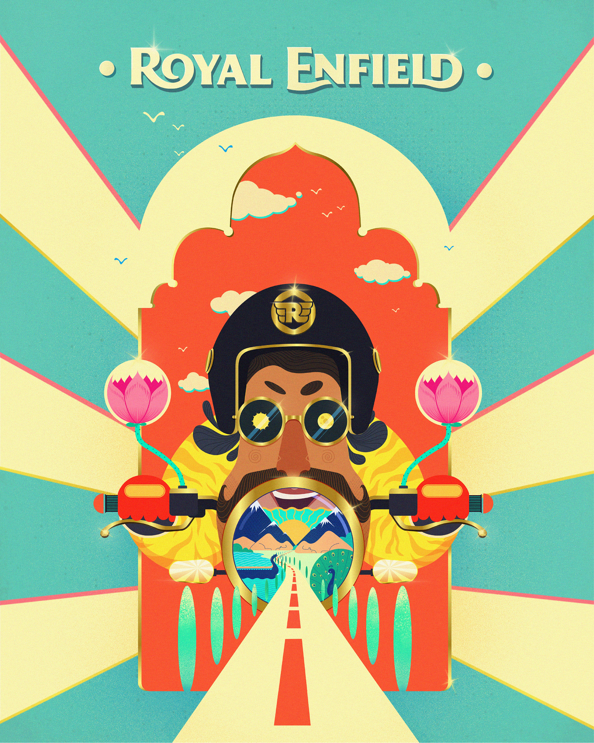 An illustration created for Royal Enfield, portraying the spirit of a passionate traveler experiencing India on two wheels. Inspired by India’s national symbols and cultural elements, the artwork blends bold pop colors with Indian aesthetics to celebrate travel, freedom, and heritage through the brand’s lens.