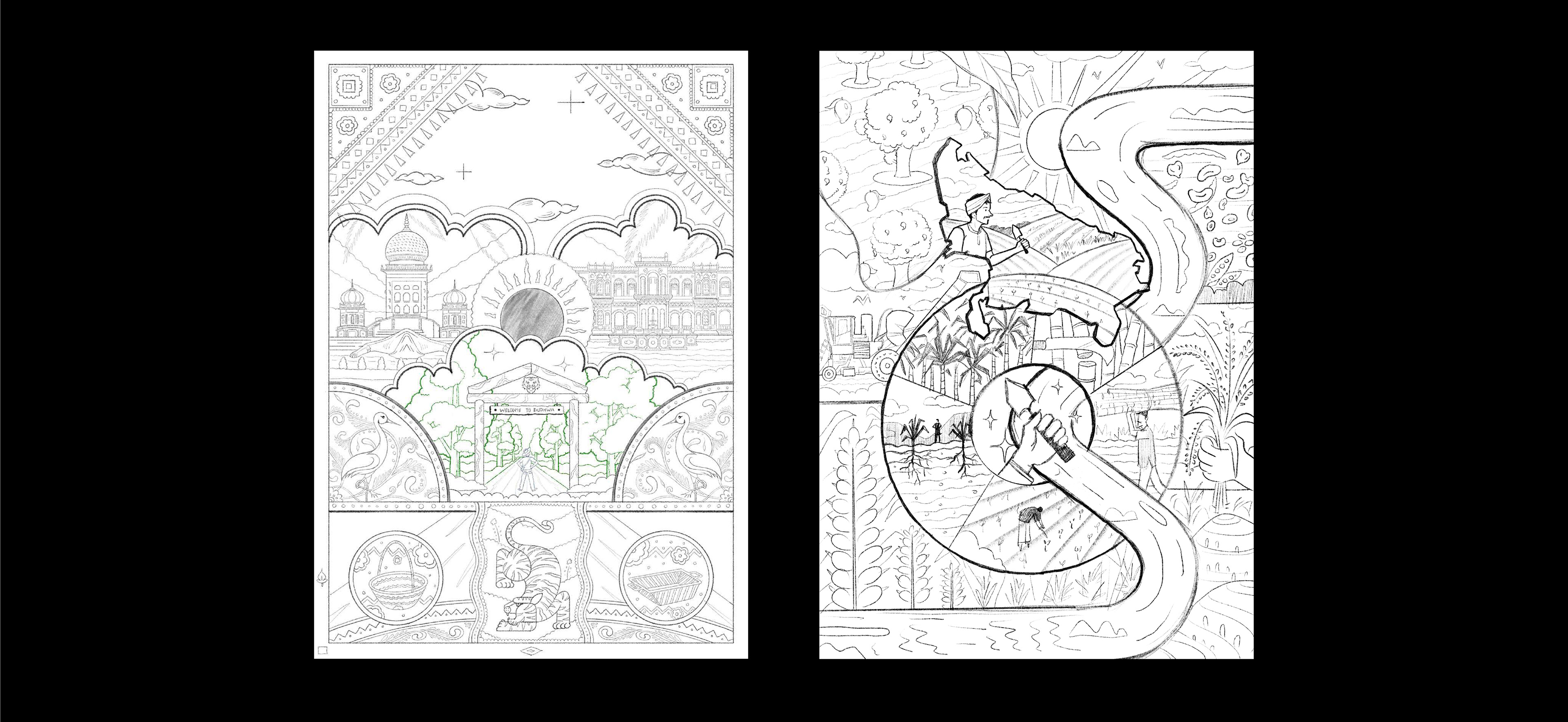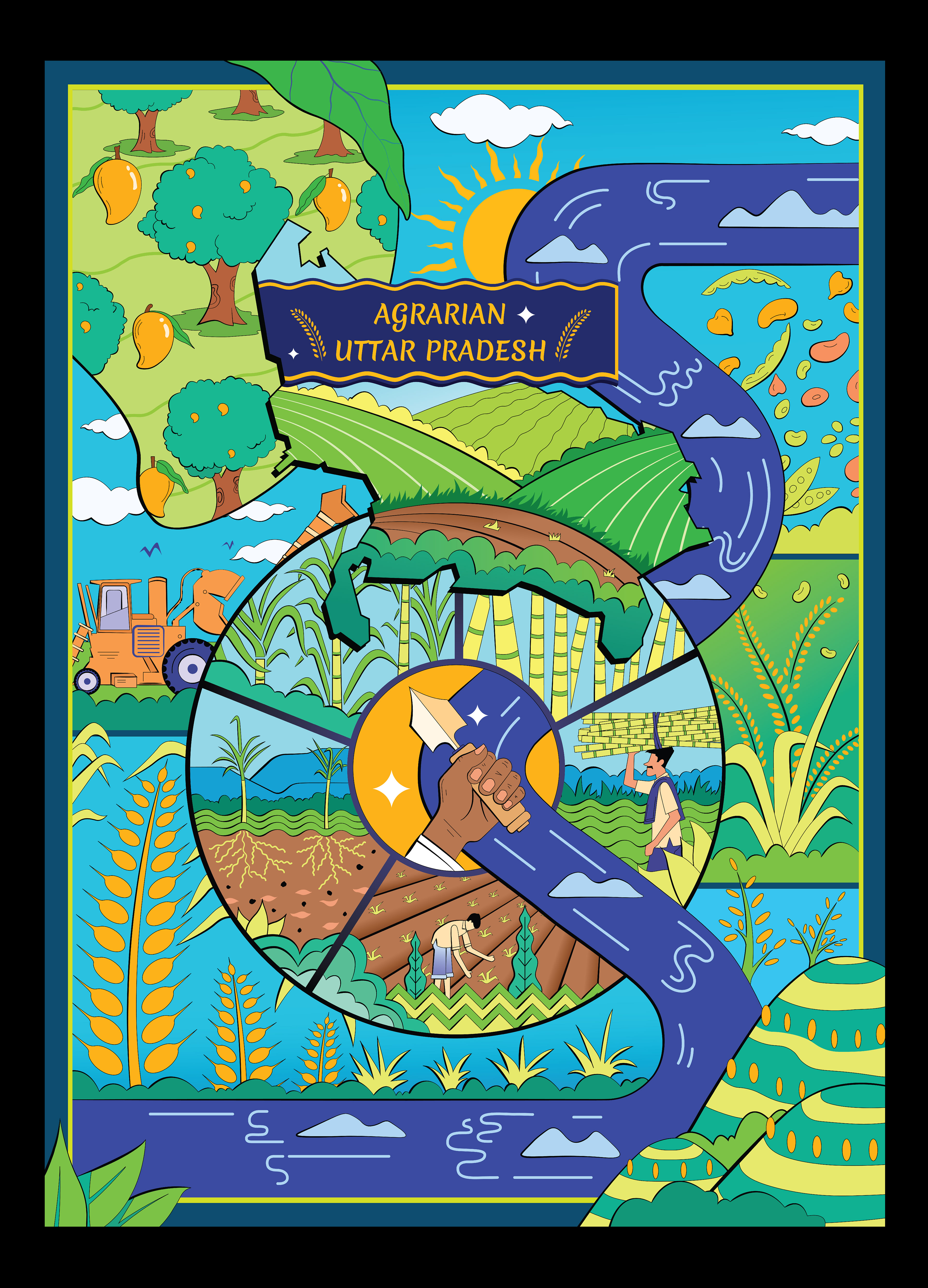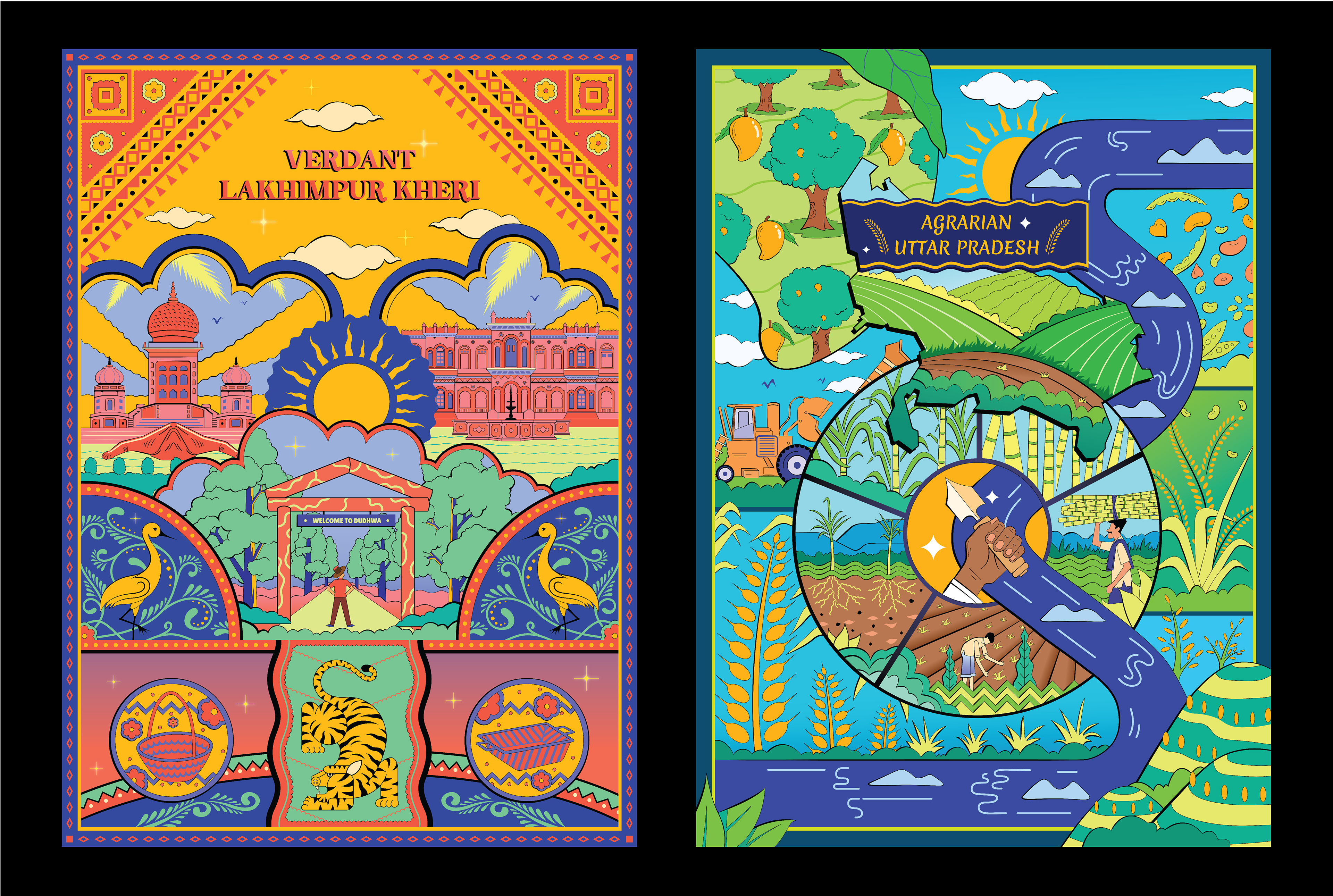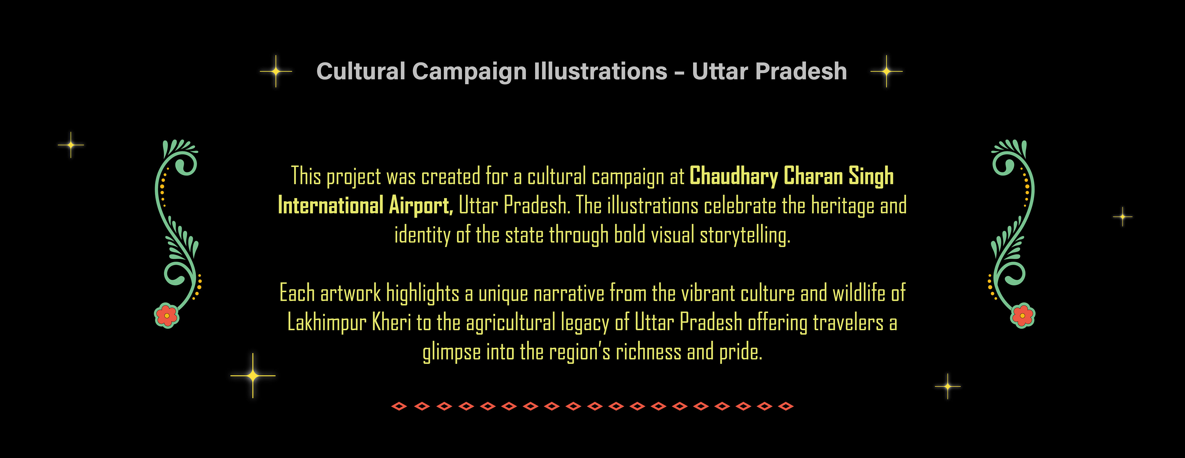 Clean, vibrant illustrations created for a cultural campaign, welcoming travelers in the waiting areas of Chaudhary Charan Singh International Airport, Uttar Pradesh.